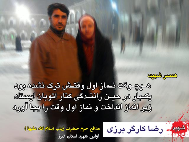 پدر شهید: پزشکان رضا را جواب کرده بودند ، به ما می گفتند باید بنشینید تا مرگ رضا فرا برسد ، دلم شکست ، جوونم جلوی چشمام داشت از بین می رفت . خیلی غمزده شده بودیم ، متوسل شدم به حضرت زینب س به بی بی جان گفتم « یا حضرت زینب س ، رضا را شفا بده برای خودتان » .